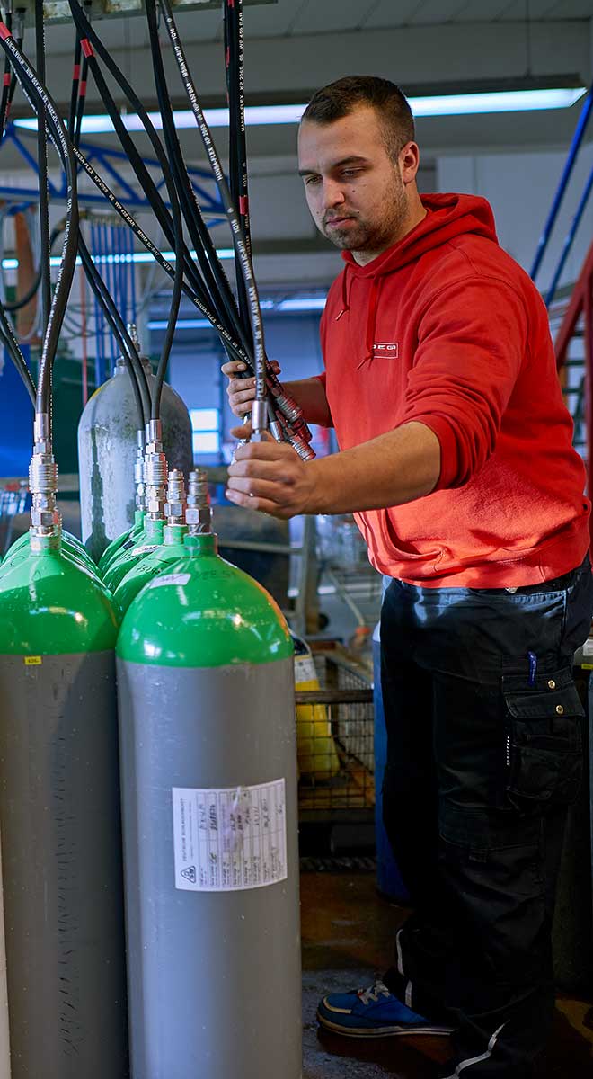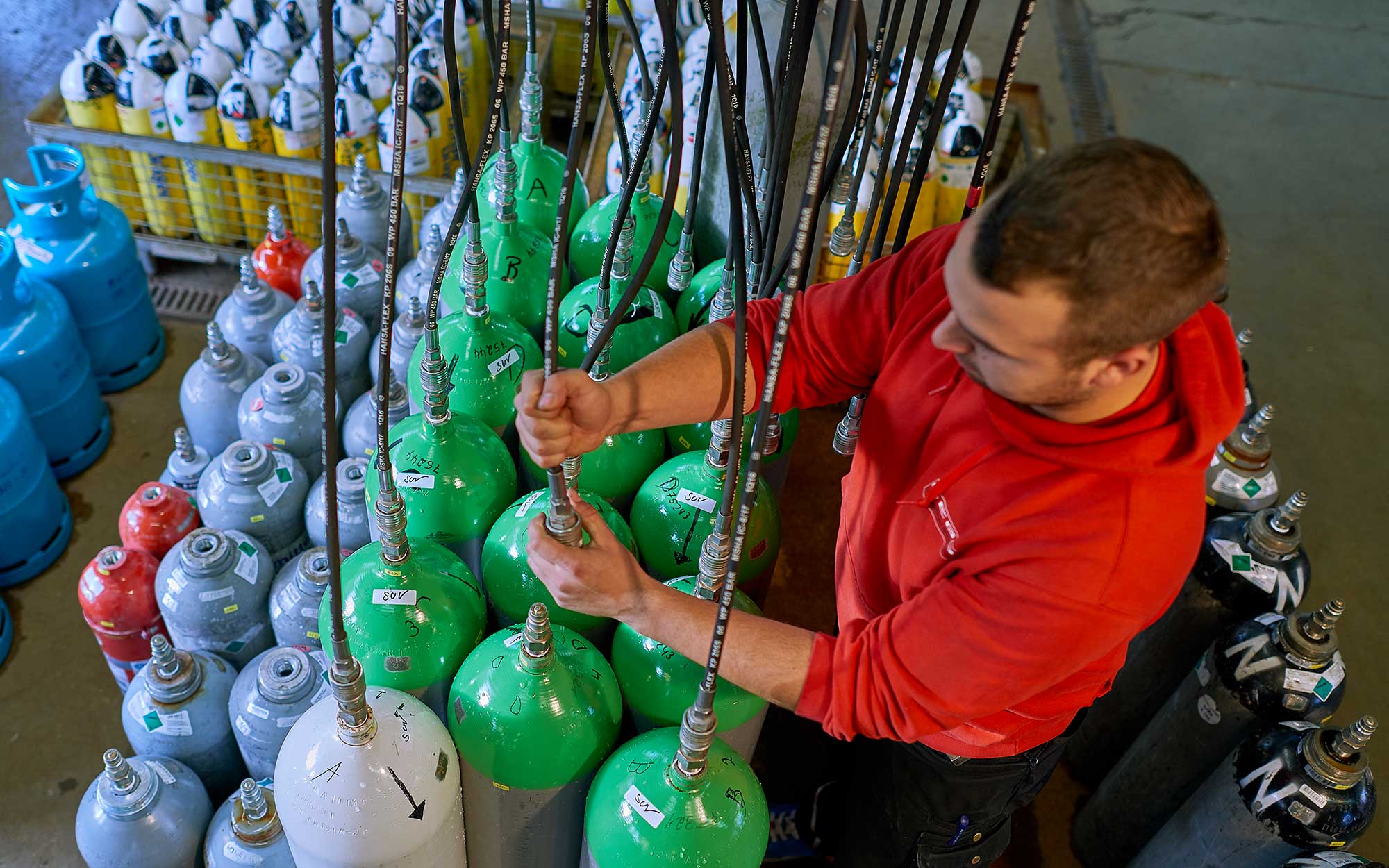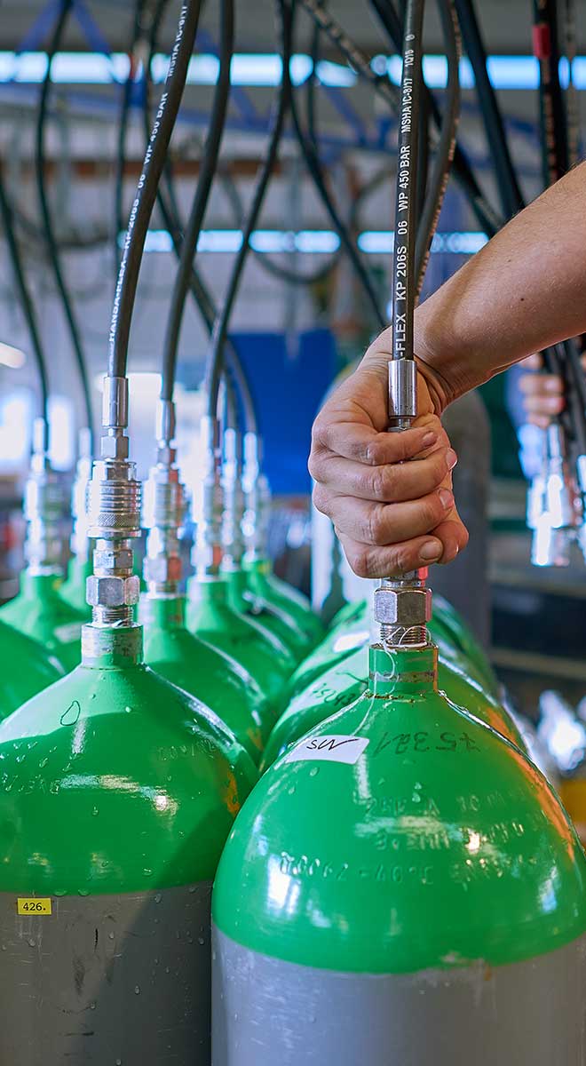 Moderne Dosier- und Steuersysteme an den Abfüllanlagen ermöglichen effiziente und schnelle Abfüllung der Gase.