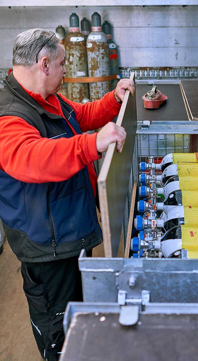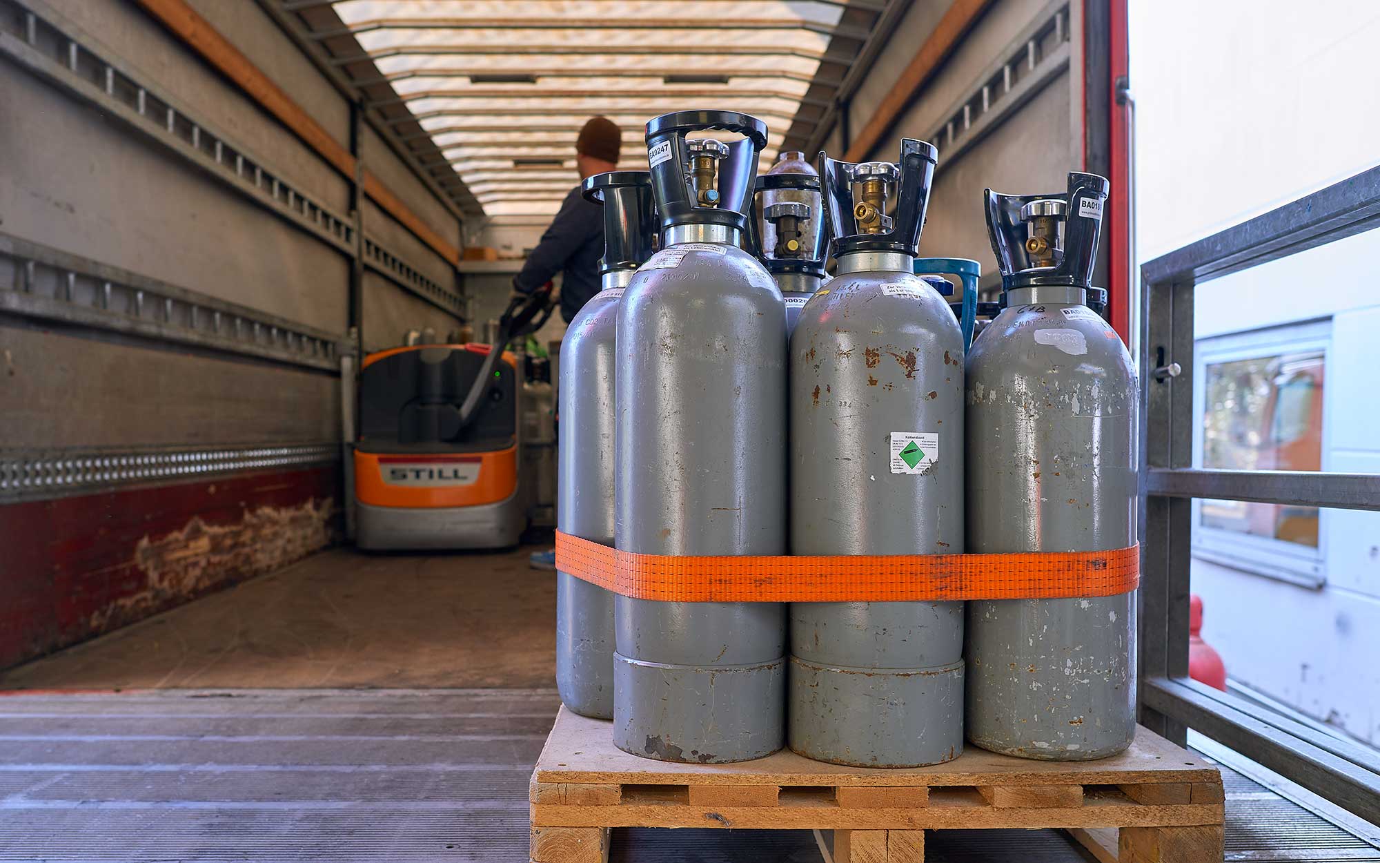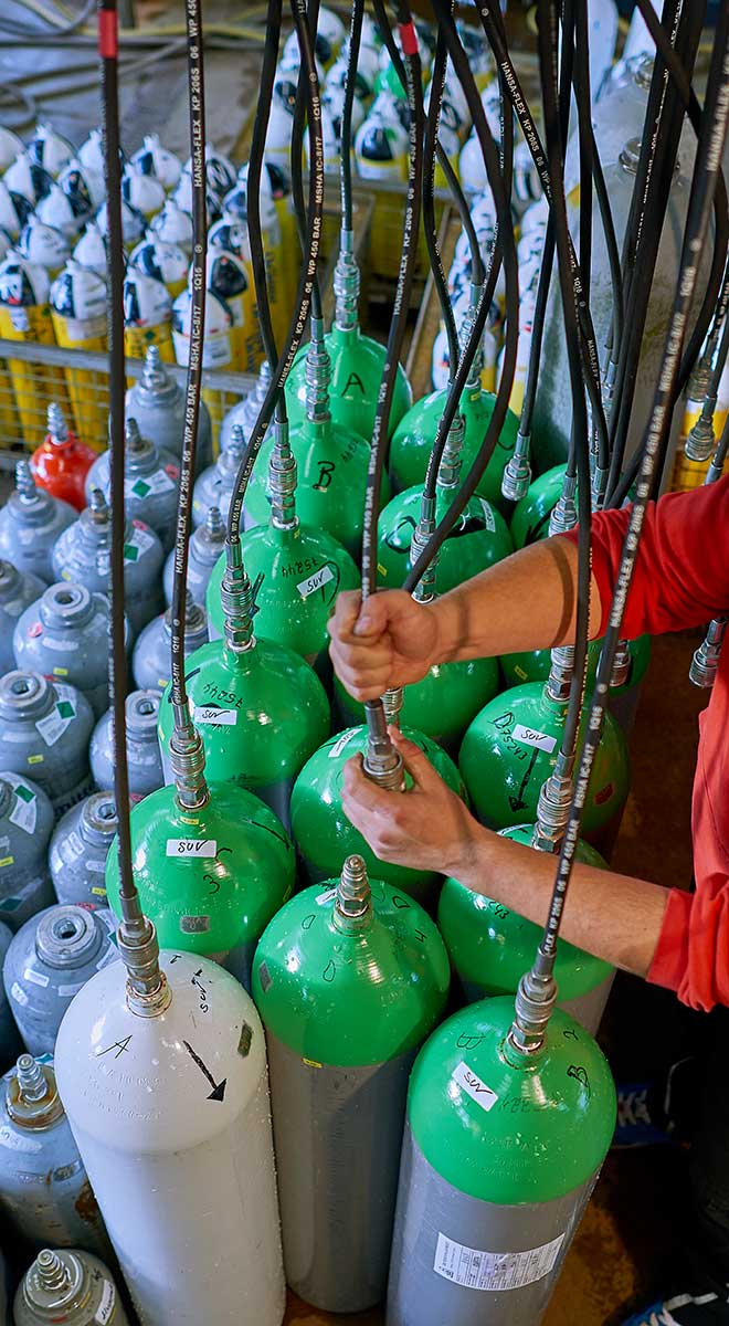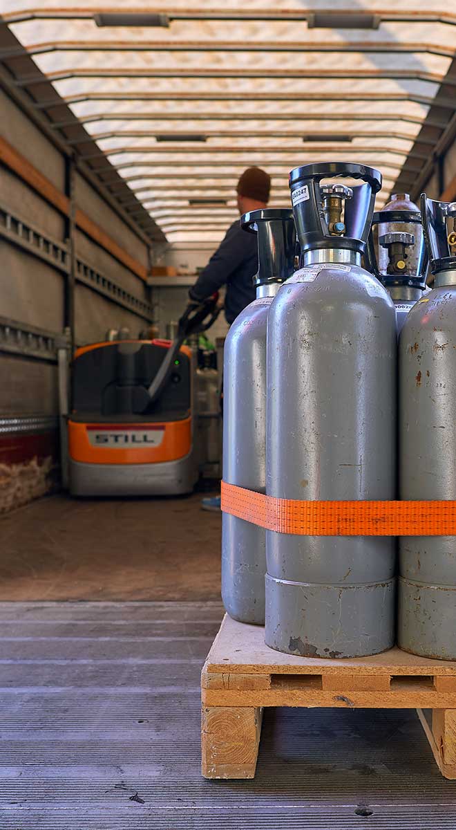 Moderne Dosier- und Steuersysteme an den Abfüllanlagen ermöglichen effiziente und schnelle Abfüllung der Gase.